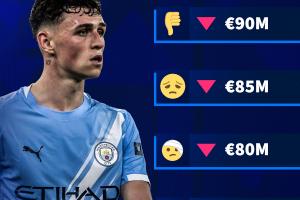 北京时间2025年10月16日讯 明日德转将更新英超球员身价,德转官方社媒今日发图预热福登身价变化,球员身价必定下跌,最多跌至7500万。