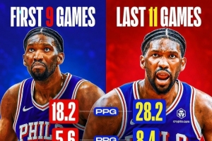 越打越好!恩比德前9场仅18+5!近11场28+8 命中率提升一成!