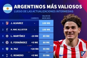 北京时间2025年10月18日讯 德国转会市场更新了部分球员的身兼,并列出阿根廷球员德转身价排名,阿尔瓦雷斯、麦卡利斯特1亿欧居首。