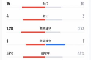 枪手vs曼联全场数据:枪手15射4正曼联3射正3球 预期进球1.2-0.73