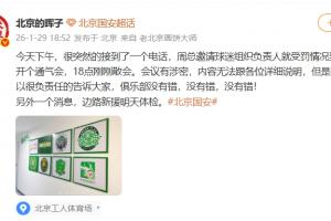 博主 style='color:red;' href=/qiudui/lanqiu/23146.html>北京的晖子在社媒写道:“今天下午,很突然的接到了一个电话,周总邀请球迷组织负责人就受罚情况到工体开个通气会,18点刚刚散会。会议有涉密,内容无法跟各位详细说明,但是我可以很负责任的告诉大家,俱乐部没有错,没有错,没有错!