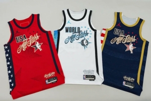 其中 style='color:red;' href=/qiudui/zuqiu/182.html>美国队包含两款球衣:一款饰有星形图案的红色球衣,以及一款带有条纹 style='color:red;' href=/qiudui/zuqiu/5895.html>元素的蓝色球衣。世界队则采用以地球图案点缀的白色球衣。这三款由Jordan品牌特别设计的球衣,背面号码上方均将印有球员所属国家的国旗。这款命名为"Jordan品牌NBA全明星赛球迷版球衣"的产品,将于 style='color:red;' href=/qiudui/zuqiu/182.html>美国东部时间周三上午10点在NBA官方商店和耐克官网同步发售。