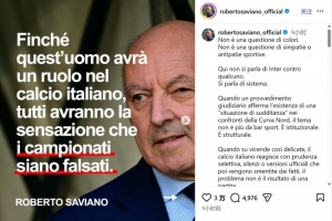 萨维亚诺对马洛 style='color:red;' href=/qiuyuan/zuqiu/435.html >塔的抨击十分直接,他甚至在 Instagram发文时配上了马洛 style='color:red;' href=/qiuyuan/zuqiu/435.html >塔的照片。身为 style='color:red;' href=/qiudui/zuqiu/107.html>那不勒斯死忠的萨维亚诺特意强调,自己的立场与球队无关,他说:“这不是球衣颜色的问题,也不是体育层面的好恶问题。这不是 style='color:red;' href=/qiudui/zuqiu/110.html>国际 style='color:red;' href=/qiudui/lanqiu/22149.html>米兰对阵某支球队的问题,而是体系的问题。当一份司法裁定明确指出,存在某些‘受控局面’时,这件事就不再是酒吧里的闲聊话题,而是上升到了体制与结构性问题。当 style='color:red;' href=/qiudui/zuqiu/199.html>意大利足坛面对如此敏感的事件,却采取选择性谨慎、集体沉默,或是推出随后被事实戳穿的官方说辞时,问题就不再是一场比赛的结果。”