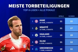 北京时间2025年10月20日讯 《转会市场》统计了本赛季五大联赛球员在俱乐部各项赛事的直接参与进球总数情况,凯恩、姆巴佩、哈兰德分列前三。