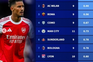 本赛季五大联赛球队场均最少失球榜:阿森纳居首,米兰、罗马在列
