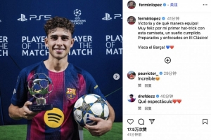 北京时间2025年10月22日讯 在本轮欧冠小组赛的一场比赛中,巴萨主场6-1击败奥林匹亚科斯,比赛中巴萨边锋费尔明上演帽子戏法。