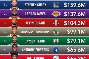 本年度球星收入排行:库里1.596亿居首 詹姆斯1.376亿居次 KD第三