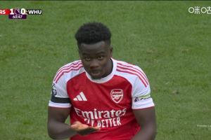 北京时间2025年10月04日讯 英超第7轮,阿森纳vs西汉姆联。比赛第60分钟,萨卡被对手打到脸部,鼻子出了点血。