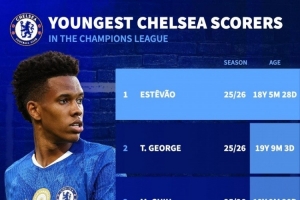 北京时间2025年10月23日讯 德国转会市场列出了切尔西队史欧冠最年轻进球者排名,埃斯特旺居首。