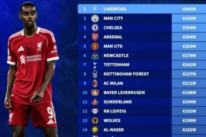 2025年俱乐部转会费支出榜:利物浦4.83亿欧居首,前8均来自英超
