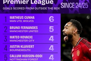 北京时间2025年10月26日讯 曼联在本轮英超4-2力克布莱顿,库尼亚远射建功。数据统计显示他也是上赛季至今英超禁区外破门次数最多的球员。