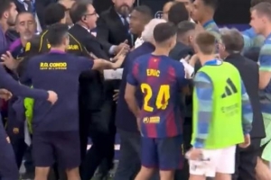 北京时间2025年10月27日讯 据西媒eldesmarque报道,国家德比比赛临近结束时,巴萨中场佩德里吃到第二张黄牌被罚下场,这一事件成为了“导火索”,直接引发了双方替补席人员的“大规模混战”。场面一度失控,以至于安保不得不迅速介入,强行将两队替补席分隔开。