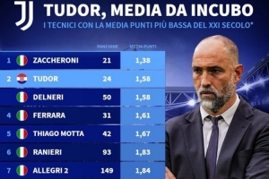 北京时间2025年10月28日讯 德转统计表明,图多尔执教尤文场均1.58分,是21世纪场均积分并列第二少的尤文教练。