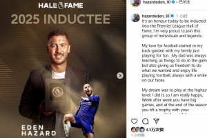 北京时间2025年10月29日讯 英超官方宣布,切尔西名宿阿扎尔入选英超名人堂。阿扎尔更新社媒,谈到自己得奖的兴奋之情。