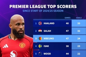 北京时间2025年10月31日讯 《转会市场》统计了上赛季至今的英超射手榜,哈兰德已经反超萨拉赫居首。