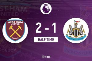 北京时间2025年11月2日讯 北京时间11月2日22点,英超第10轮,西汉姆联在主场迎战纽卡斯尔联。上半场,鲍文射中立柱,墨菲抽射破门,帕奎塔扳平比分,博特曼自摆乌龙。上半场西汉姆联2-1纽卡斯尔联。
