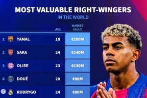 北京时间2025年11月3日讯 德转列当前世界足坛右边锋身价排行,亚马尔2亿欧居首,萨卡1.4亿欧第二,奥利塞1.3亿欧第三。