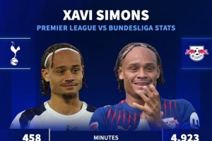 北京时间2025年11月4日讯 德国转会市场统计了热刺新援哈维-西蒙斯在德甲和英超的数据,并做出对比。