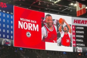 北京时间2025年11月4日讯 快船主场迎战热火,首节暂停期间,球队播放了致敬旧将鲍威尔的视频,鲍威尔也鼓掌致谢。