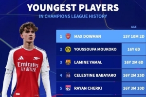 北京时间2025年11月5日讯 欧冠联赛阶段第4轮比赛,阿森纳在客场以3-0的比分完胜布拉格斯拉维亚。本场比赛,阿森纳15岁小将道曼替补登场成欧冠历史出场最年轻球员。