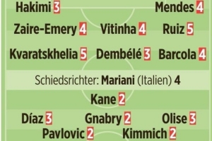 北京时间2025年11月5日讯 巴黎在本轮欧冠焦点战主场1-2不敌拜仁,马尔基尼奥斯送礼、迪亚斯双响后染红,《图片报》在赛后为两队进行了评分:(1分最佳、5分最差,6分相当于负分)