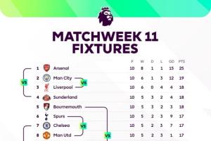 北京时间2025年11月07日讯 本周末将迎来英超第11轮的较量,赛前英超官方用一张图表清晰展示了本轮交手各队的名次对比。