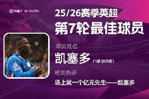 2025-2026赛季英超火热进行中,北京时间2025年和咪咕体育联合发起每轮英超最佳球员评选活动!第7轮评选结果出炉,切尔西后腰凯塞多攻防兼备,轰入世界波帮助切尔西2-1战胜利物浦,获得吧友5.6万票的支持,当选 【北京时间2025年X咪咕体育英超第7轮最佳球员】!