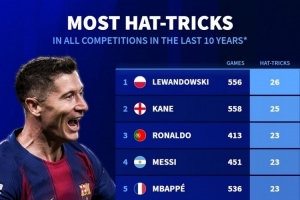 近10年前十联赛球员戴帽榜:莱万26次居首,凯恩25次、梅罗23次
