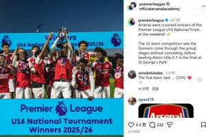 北京时间2025年11月11日讯 英超官方宣布,阿森纳U16梯队在上周末问鼎英超U16全国锦标赛冠军。