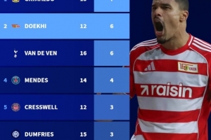 北京时间2025年11月11日讯 欧洲五大联赛有着一些带刀后卫属性的球员,格里马尔多、多克希等人是其中的佼佼者,德国转会市场盘点了本赛季五大联赛进球最多的后卫,格里马尔多以7球居首,多克希、范德芬以6球并列次席。
