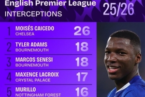 本赛季英超拦截榜:凯塞多独自领跑,拉克鲁瓦、詹姆斯在列