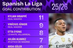 北京时间2025年10月7日讯 日前,Squawka统计了本赛季西甲参与进球次数排行,姆巴佩参与11球居首。