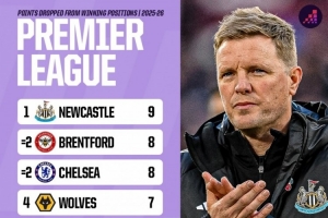 北京时间2025年11月11日讯 Opta统计了本赛季英超球队领先之后丢掉的积分,并列出榜单,纽卡9分最多,布伦特福德切尔西8分次席。