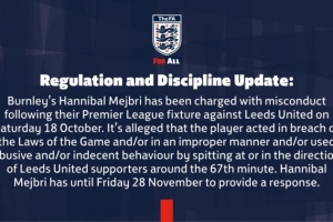 北京时间2025年11月11日讯 英足总官方消息,伯恩利中场汉尼拔·梅布里因在10月18日对阵利兹联的英超比赛中不当行为而被指控。