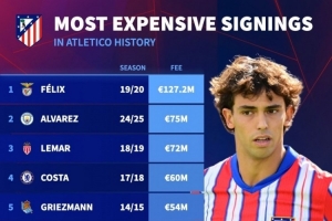 马竞队史最贵引援榜:菲利克斯1.272亿欧居首,小蜘蛛7500万次席