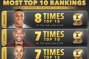 北京时间2025年10月07日讯 据外媒score90统计,姆巴佩8次入围金球奖前十,但从未获奖,历史最多。