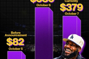 北京时间2025年10月8日讯 根据二手票务平台的报道,在姆斯发布“决定二”预告前,湖人新赛季最后一个主场最便宜的票价为82美元。而随着姆斯发布预告,最低票价上涨到580美元。
