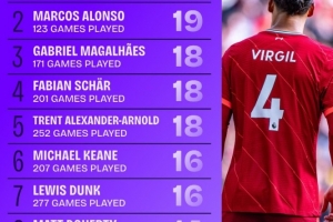 17-18赛季来英超后卫进球榜:范戴克21球居首,加布里埃尔18球第3