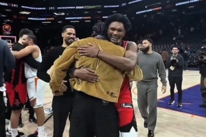 GIF- style='color:red;' href=/qiudui/lanqiu/2.html>火箭& style='color:red;' href=/qiudui/lanqiu/11.html>太阳赛后双方球员叙旧拥抱