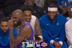 这说啥了🤣?詹姆斯在场上和替补席的欧文聊天 直接笑出表情包