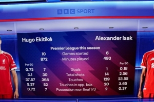 以下为 style='color:red;' href=/qiudui/zuqiu/32.html>利物浦两大锋线新援 style='color:red;' href=/qiuyuan/zuqiu/9.html >埃基蒂克、伊萨克本赛季英超数据对比,具体如下(括号内为每90分钟数据):
