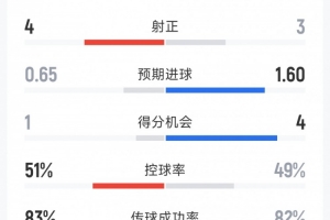 尤文1-0博洛尼亚全场数据:射门13-12,射正3-4,得分机会4-1