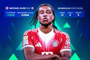 北京时间2025年10月14日讯 德转更新德甲身价,奥利塞身价暴涨3000万欧元,从1亿跃升至1.3亿欧,穆西亚拉1.4亿不变。