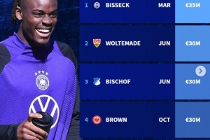 以下为2025年为德国队上演首秀球员身价情况(首秀时间为当时所在俱乐部):