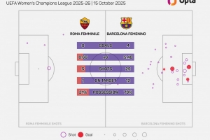 北京时间2025年10月16日讯 女足欧冠联赛阶段第二轮比赛,巴萨女足客场4-0大胜罗马女足。