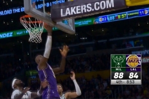 奋力追击!詹姆斯里突外投连得5分 帮助湖人迫近比分打停雄鹿